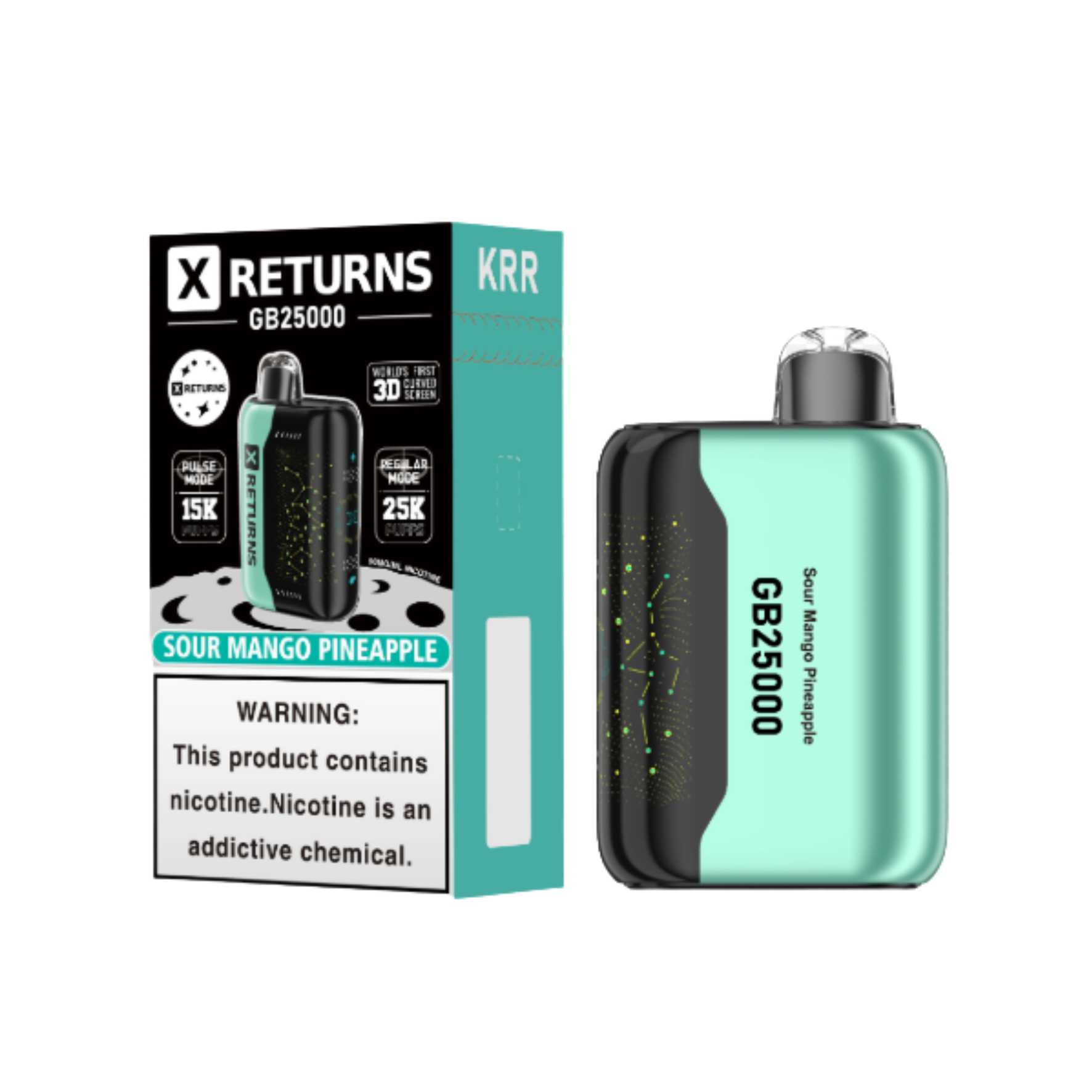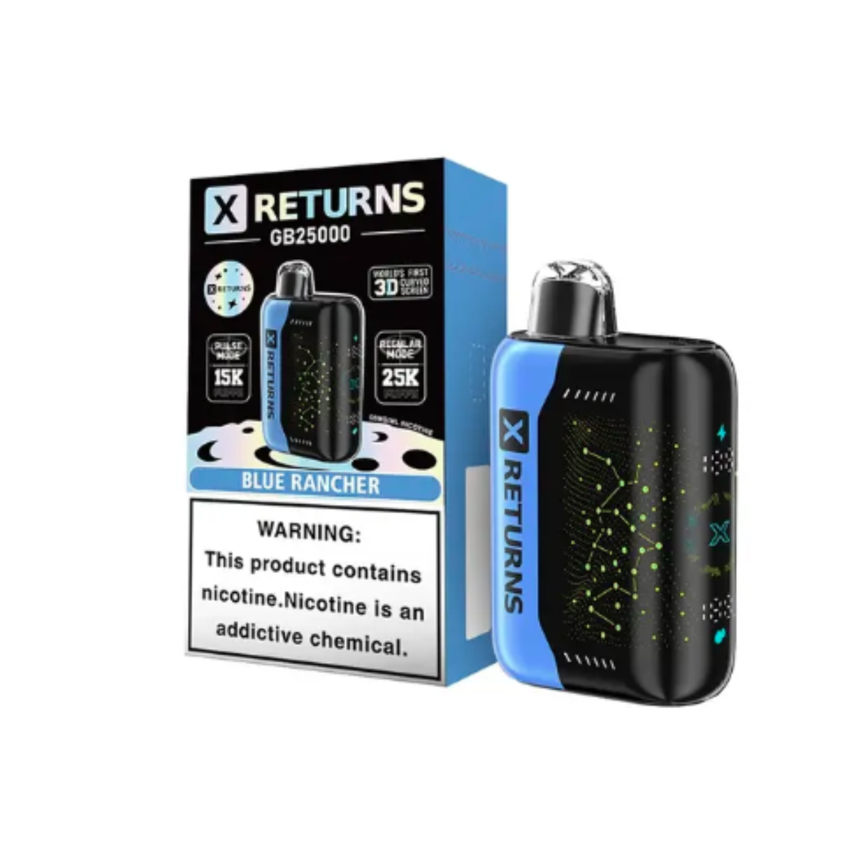 The X Returns GB 25K Puffs Disposable Vape is a revolutionary device, offering up to 25,000 puffs with its Regular Mode, or 15,000 puffs in Pulse Mode. Featuring an 18ML pre-filled e-liquid capacity and a nicotine strength of 50mg/ml, this vape ensures a premium experience with its groundbreaking 3D curved screen. Elevate your vaping experience with this state-of-the-art device designed for performance and style.
